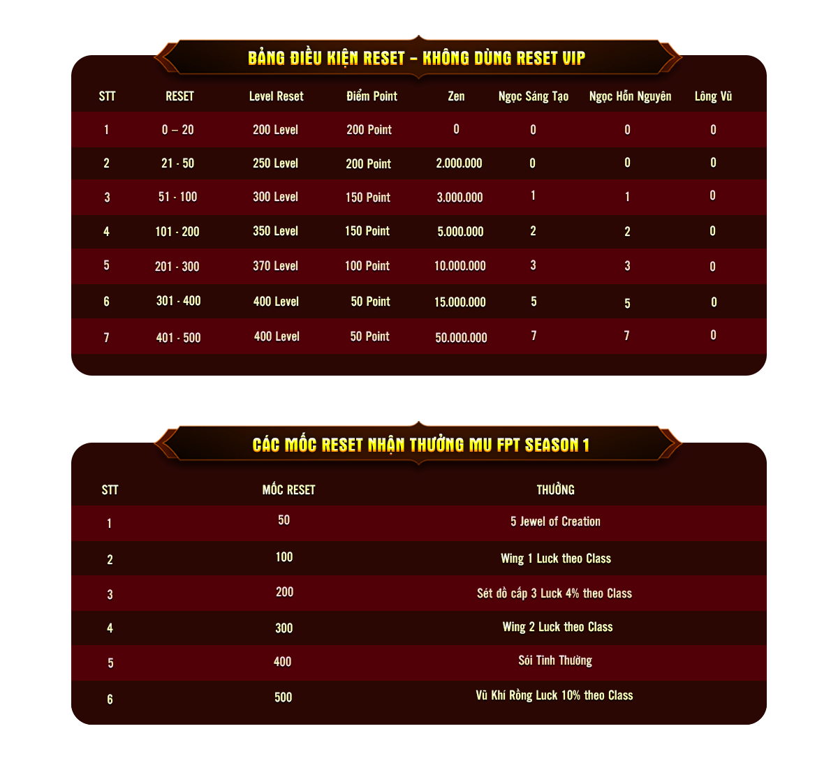 Bảng Điều Kiện Reset